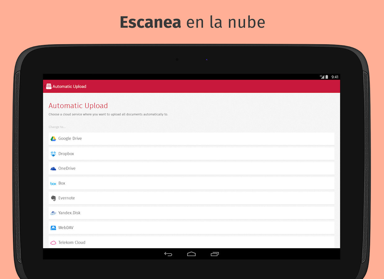 • Integración en la nube: Google Drive, Box, Dropbox, Evernote, OneDrive, Telekom Cloud, WebDAV y Yandex.Disk