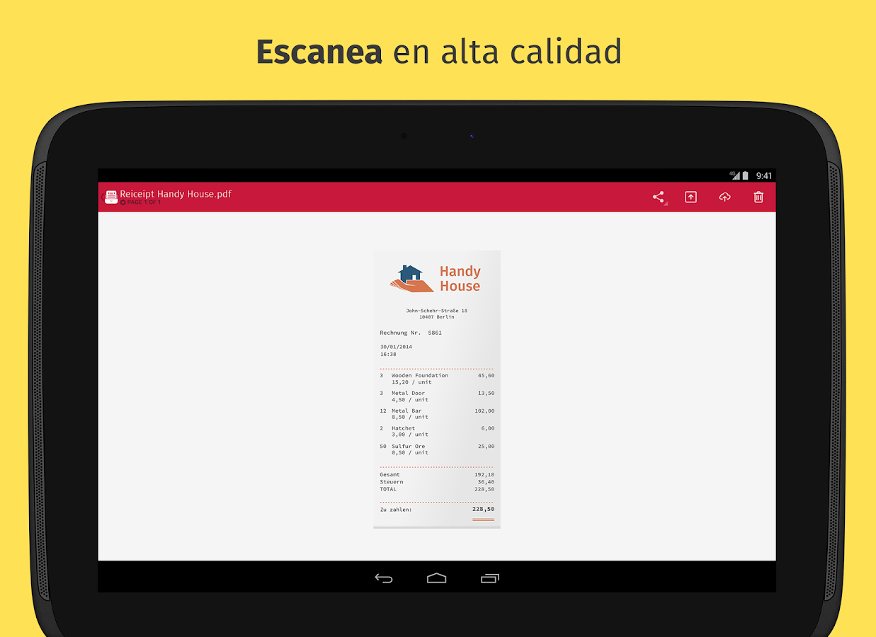Scanbot utiliza la última y más avanzada tecnología disponible de escaneo con el móvil. Tus escaneos tendrán una calidad excelente de hasta 200 ppp, similar a la obtenida con los modernos escáneres de escritorio. Además, hay varios modos de color, optimización automática y reducción de desenfoque, lo cual te ayudará a sacar el máximo provecho de tus escaneos.